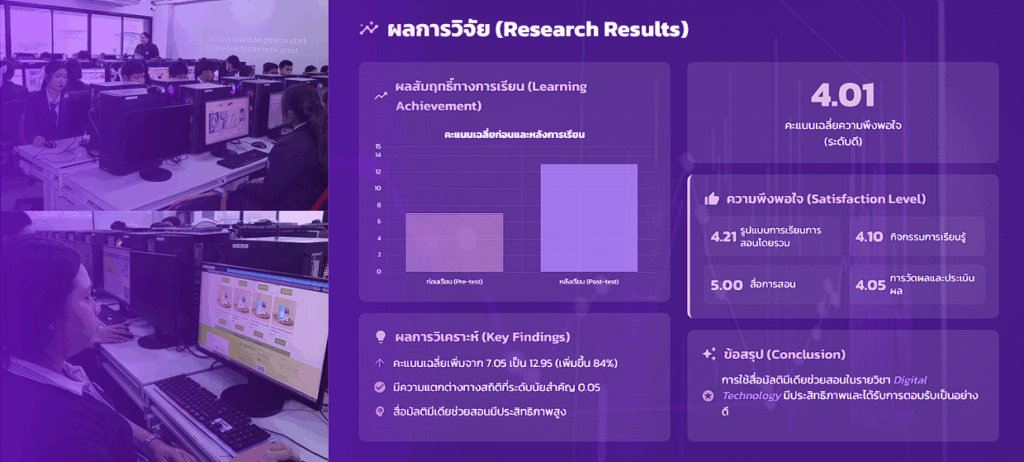 นอกจากนี้ ผลการประเมินความพึงพอใจของนักศึกษายังสูงถึงระดับ 4.34 จาก 5.00 ซึ่งสะท้อนอย่างชัดเจนว่า เด็กไม่ได้ต่อต้านการเรียนรู้ แต่ระบบการเรียนรู้ที่ดีต้องตามจังหวะของเขาให้ทัน และต้องดึงเขาเข้ามามีส่วนร่วมในห้องเรียน