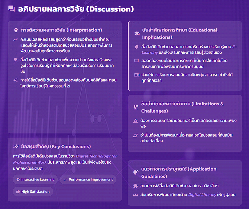 สิ่งที่น่าสนใจคือ นักศึกษายังให้คะแนนเต็ม 5 ในหัวข้อ “สื่อการสอน” และนี่คือหลักฐานว่า Multimedia Learning ไม่ได้เป็นแค่เทรนด์สวยหรู แต่เป็นเครื่องมือที่ทำให้เด็กเข้าใจเนื้อหาได้จริง